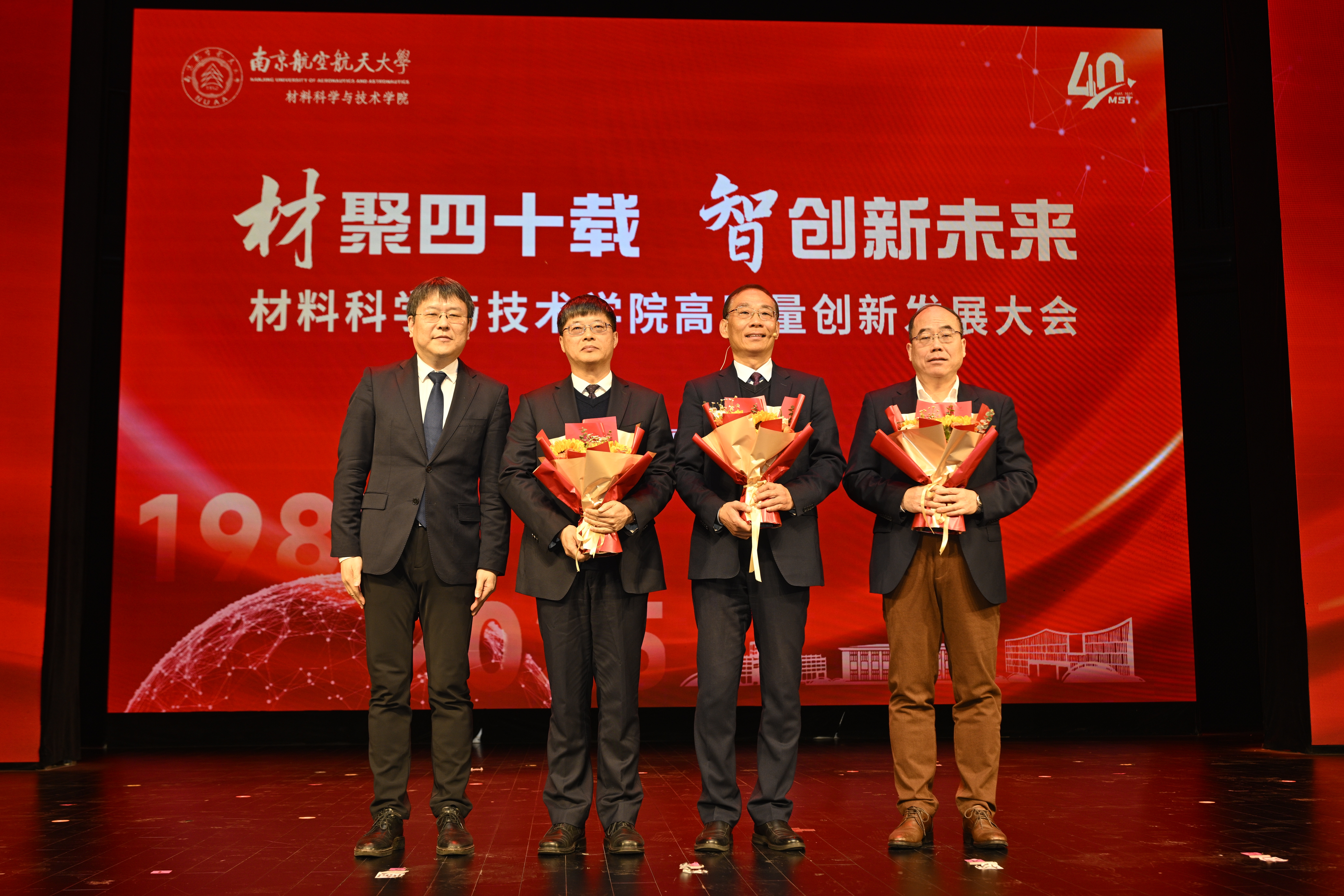 陶杰、姚正军、张校刚作为历任院长代表致辞。他们回忆了在学院的工作历程,四十载栉风沐雨、筚路蓝缕,凝聚着一代代材料人的赤诚坚守,更离不开学校领导、师生及广大校友的鼎力支持,愿学院未来笃行致远,再创佳绩,为学校建设和国家发展贡献更多材料担当。顾冬冬向历任院长代表献花,学生代表为学院老领导、离退休老教师献花,表达深切感恩与真挚敬意。