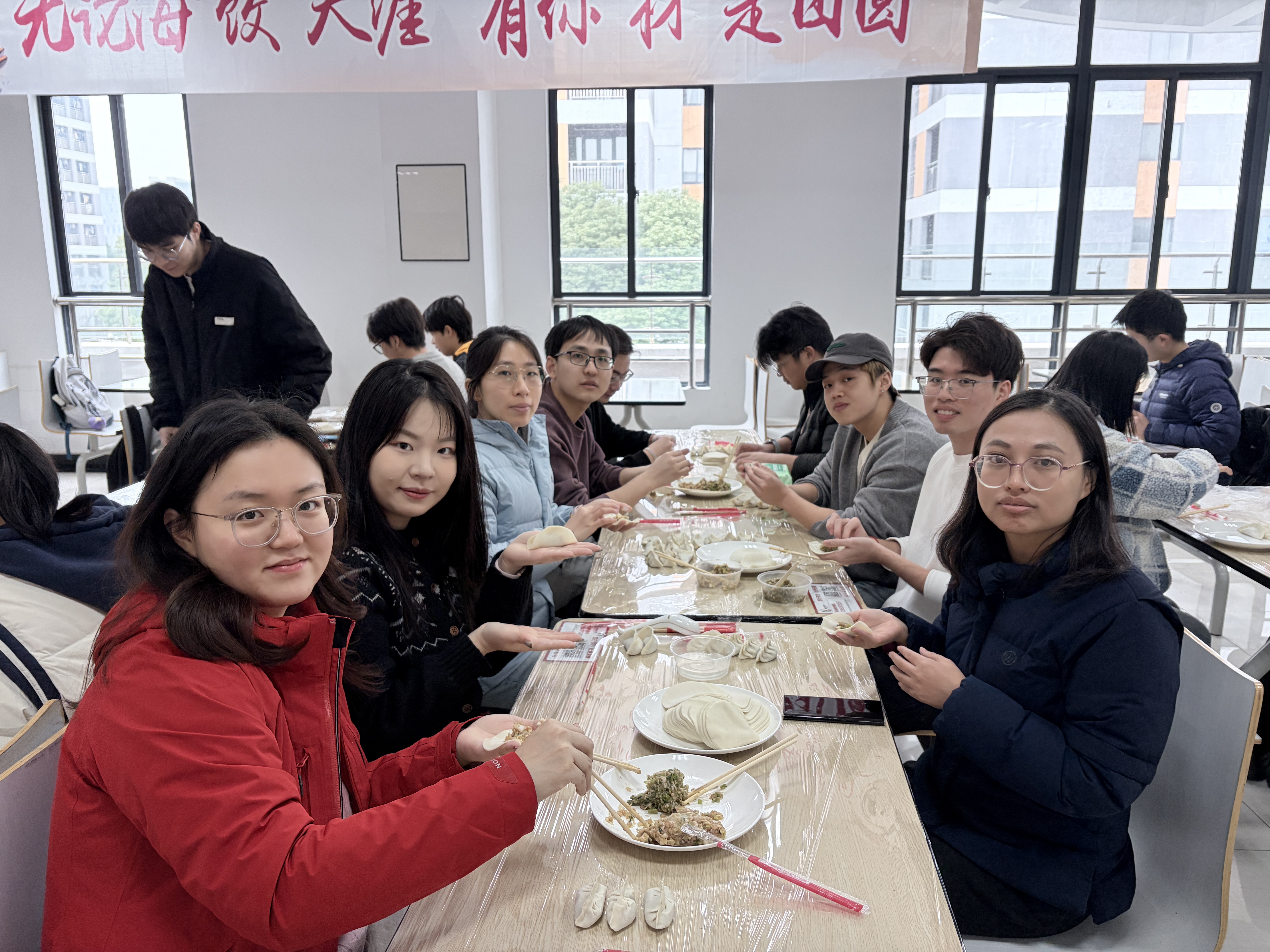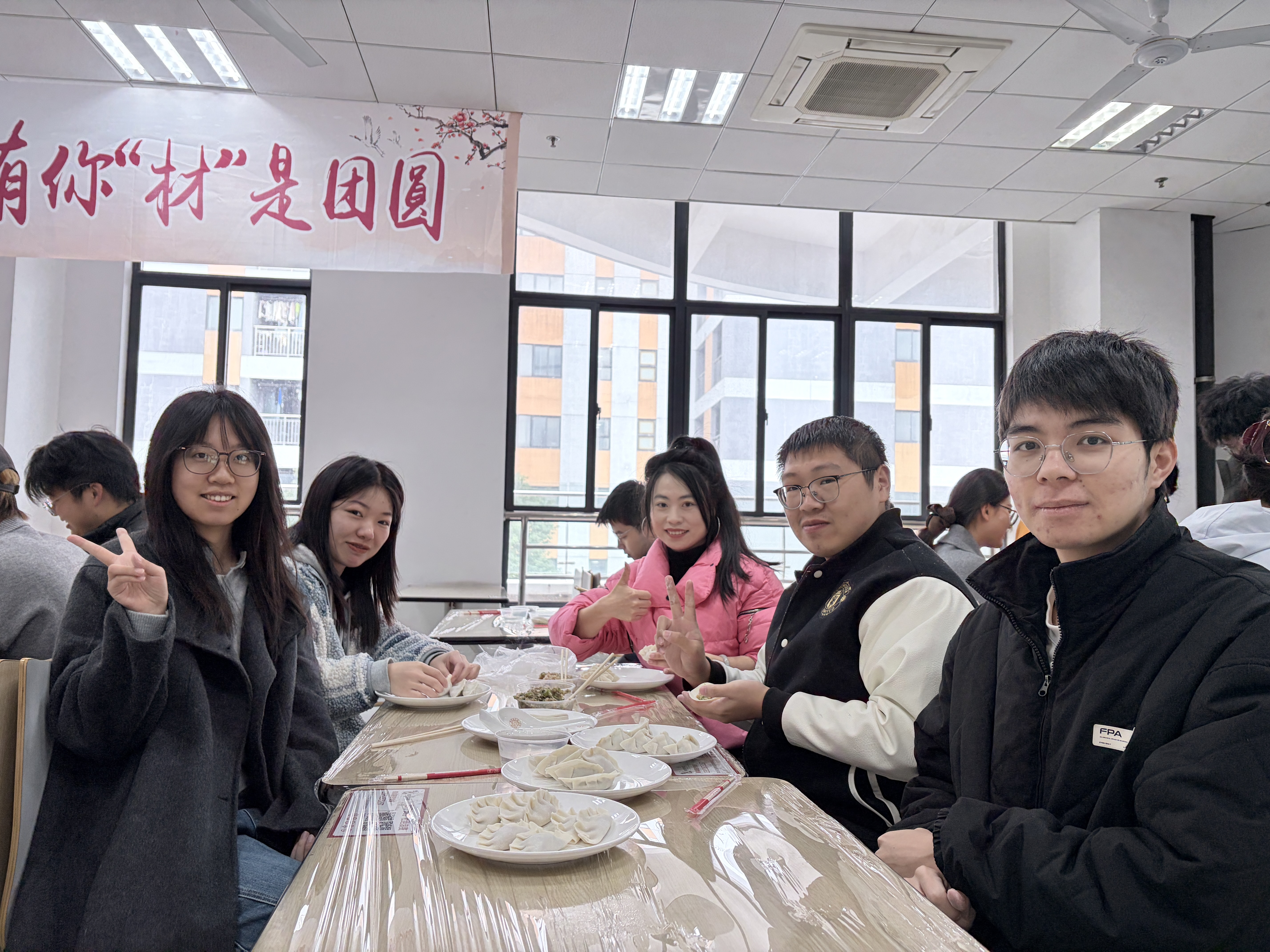 活动现场暖意融融,大家围站桌前,分工协作、默契十足:一手托着薄薄的饺子皮,一手麻利地填馅儿,双手一捏,一只只形态各异的饺子便整整齐齐地码在了盘中。往日里那份严谨专注的氛围,也在欢声笑语中悄然切换,化作了一场暖意融融的 “家庭聚会”。包饺间隙,学院领导、班主任、导师们与同学们亲切攀谈,不仅关切询问大家的日常生活起居,还细致了解近期的科研进展与期末复习情况,反复叮嘱同学们天寒注意添衣、合理安排作息,一句句暖心话语如同冬日暖阳,驱散了寒意。