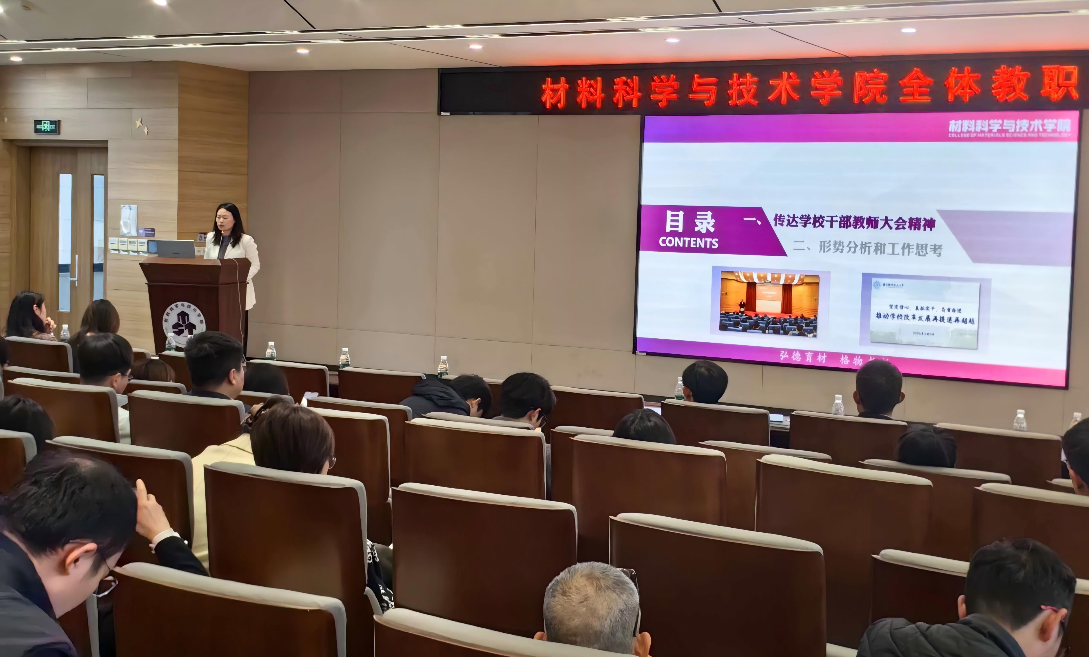 顾冬冬传达了学校干部教师大会精神,领学了学校《落实教育强国建设规划纲要精神行动计划(2026—2035年)》,2026年是“十五五”规划的开局之年,也是学校启动实施“十年行动计划”关键之年。他指出,学院需紧跟学校“十五五”发展思路,锚定学校总体目标,结合学院实际加快推进一流学科建设、高质量师资队伍建设、强化有组织科研,全面提高本科人才培养质量和优化研究生培养机制,推进学院高质量内涵式发展,为学校建设航空航天民航特色鲜明的世界一流大学贡献材料力量。